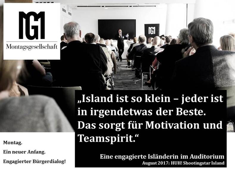 Der erstaunlichste Erfolgsfaktor: Die spezifische Kleinheit der isländischen Gesellschaft. „Weil das Land so klein ist, ist automatisch jeder Isländer in irgendetwas der Beste – und das weiß jeder Isländer ganz sicher“, erklärte eine sympathische Isländerin aus dem Auditorium. Wenn jeder Einzelne fest daran glauben könne, in einer bestimmten Sache tatsächlich der Beste zu sein, sorge das für ungeahnte Motivation und für Respekt gegenüber den Mitmenschen. Hier liege das Geheimnis des Teamspirits und der Leistungsfähigkeit des kleinen, sehr erfolgreichen Islands. HUH!